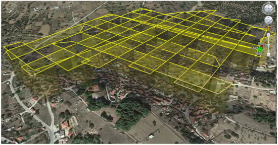 - Flight path: Directly affects the building appearance in the video footage and controls the side-overlapping of the deriving frames. These two parameters are crucial for the quality and density of the 3D point clouds, especially for points that represent the facades of the buildings. For reaching the specific research goals a flight plan was designed, using Litchi Mission hub software, taking into consideration the shape of the building blocks by following flight paths that are parallel to the streets and with a 50 m distance among them, providing 80% side overlapping, as shown in Figure 3.