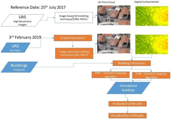 Mapping of demolished buildings by means of (i) 3D point clouds and (ii) DSM derived by UAS high-resolution images and video footage has been performed using the following two parallel processing steps: