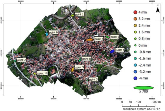 Geo-registration is a very crucial step in order to provide absolute orientation and to assign the proper scale to the orthorectified aerial high-resolution images and the 3D point cloud. Thus, it was necessary to add an adequate number of GCPs measured, in the Greek reference system GRS-87, using the RTK technique. The accuracy of the produced orthophoto and DSM, as shown in Table 1 depicts the values of the total RMS error. More specifically, for the geo-registration of the UAS survey 3rd February 2019, 10 GCP’s were used with a total RMS of 2.2 cm. GCP locations and error estimates are depicted in Figure 5, and from the geo-registration accuracy achieved, we can conclude that the precision of the geoinformation produced is of satisfactory accuracy for 3D monitoring and mapping.