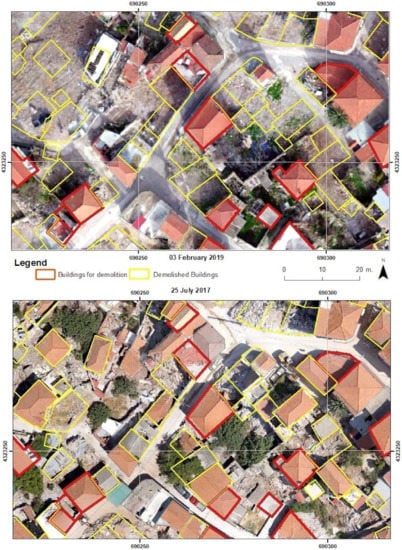 The top orthophoto map of 3rd February 2019 derived from UAS 4K-video footage presents the demolished buildings mapped by photo interpretation and fieldwork. The bottom orthophoto map of 25th July 2017, derived by UAS high resolution images, presents the buildings which have been approved for demolition by the Greek-EPO.