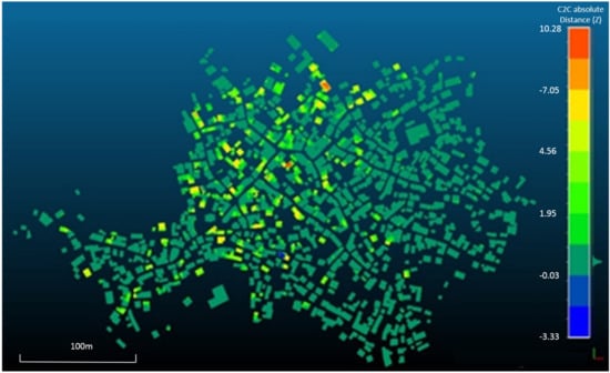 A cloud to cloud comparison was realized to describe the height differences between the buildings that were demolished or collapsed after the first flight due to post-seismic activity. The differences between the two-point clouds are measured using the least-square best fitting plane calculating the nearest point and its neighbors. As a reference cloud, the newest (03/02/2019) point cloud was selected, and the point cloud created from the data acquired on 25/07/2017 was the point cloud on which the distances will be computed. For the cloud to cloud comparison, the open-source program CloudCompare was used to calculate the distances of each point relative to the reference cloud points [47]. The newest point cloud was selected due to the higher point density. The results showed that the height differences between the two-point clouds have a variation between −3.33 and 10.28 m. In Figure 8, the absolute distance in the z-axis for the total area of building stock is illustrated. The means and the standard deviations of the calculated cloud to cloud point distances were 0.57 m and 1.40 m, respectively.