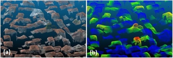 The 3D point cloud of 03/02/2019 consists of 30,840,291 points for the whole study area. A visual interpretation and comparison with the 3D point cloud of 25th July 2017 show that a large number of buildings have been demolished. By visually combining the two points clouds, the damaged buildings’ point clouds of the oldest dataset appear on top of the grounds’ point clouds of the newest one, as shown in Figure 7a,b.