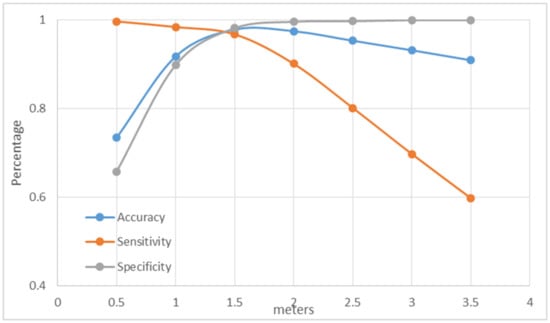 Figure 11 presents the accuracy, sensitivity, and specificity for different thresholds of the difference between the mean heights of the two point clouds. According to the results, the difference of the mean height values between the two point clouds can identify the demolished, as shown in Figure A1—case1, from non-demolished, as shown in Figure A1—case2, buildings with an accuracy of 97.8% when a 1.5 m threshold is applied for these differences, as shown in Table A1. This threshold was chosen because of its better performance in the classification of demolished buildings. However, 24 buildings are misclassified due to various reasons. Eight demolished buildings were classified as non-demolished. One of them was sited in a parcel where a new building was under construction. Therefore, there was no significant difference between the heights, as shown in Figure A1—case3. The rest of the buildings were totally collapsed by the earthquake and the height of the debris was lower than 1.5 m, hence they were misclassified, as shown in Figure A1—case4. On the other hand, 16 not-collapsed buildings were classified as collapsed. Most of them were misclassified due to partial collapse between the two acquisition dates, as shown in Figure A1—case5. Furthermore, some buildings were misclassified because of the different number of points of the clouds between the two dates. In these cases, in epoch T1, only the roof and the facade were visible due to neighborhood buildings. In epoch T2, one or more neighborhood buildings were demolished, and the side walls were then visible, leading to lower mean height values. Finally, a building was misclassified due to a deciduous tree (plane tree) covering the roof during the summer acquisition date, as shown in Figure A1—case6.