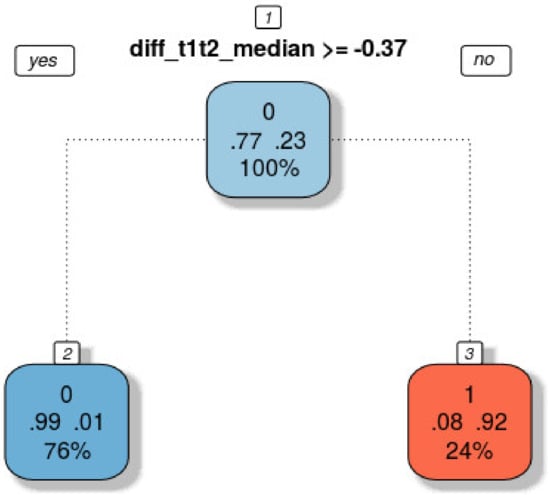 Recursive partitioning is a well-established classification approach that provides a useful alternative to the parametric methods [44,45,46]. This method does not rely on assumptions, regarding the dependency of the dependent variable, against the predictors. It is a non-parametric method for classification based on tree structures and rules extraction. The results of such a method include rules based on thresholds that need to follow in order to classify a case. The tree structure includes nodes that form mathematical sub-groupings of the learning sample with terminal nodes that cannot be split further. This partitioning method includes a pruning option that identifies a sub-tree of the saturated tree that is most “predictive” of the outcome and least vulnerable to the noise of the multivariable data.