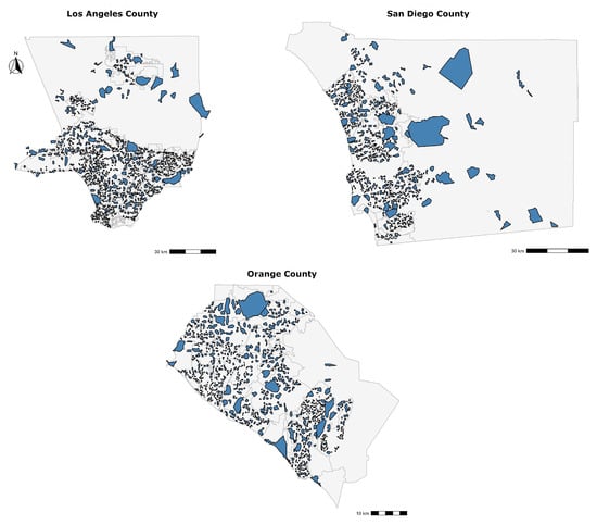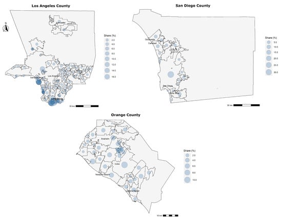 We use a snapshot of appraisal data provided by CoreLogic® [], a leading provider of property insights and solutions, for Los Angeles County, San Diego County, and Orange County, of Southern California in the US. The snapshot contains a sample of all internal appraisals conducted by the company for these counties, between 2014 and 2018, and contains the geographical locations of subjects and their associated comparable properties in the form of latitude and longitude coordinates. These coordinates are extracted from parcel polygons and different county sources and map a property’s location with high precision. Each subject property is attached with multiple comparable properties through a unique identifier which we used to distinguish a single appraisal. We were also given the street addresses for subject properties only. Figure 1 shows the share of data for the three counties, on a per city basis. Since the raw dataset consists of appraisal data that are proprietary to CoreLogic® and contains some private information, we are unable to include it here. However, readers who wish to replicate this study may do so by leveraging data made publicly available through county recorder/appraiser office databases available on the Internet.