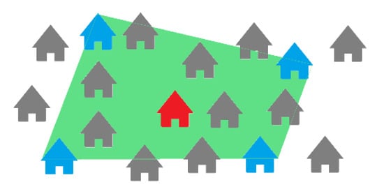 The illustration in Figure 2 represents how we define coverage for a subject property. The subject, highlighted in red, is surrounded by different properties, among which those in blue were chosen as comparable properties during an appraisal, which led to the conclusion that at least the area in green was scoped by the appraiser to find the four comparable properties and is now defined as the coverage of this subject. Through these coverage polygons, we can also find subjects that overlap most and could present similar characteristics.