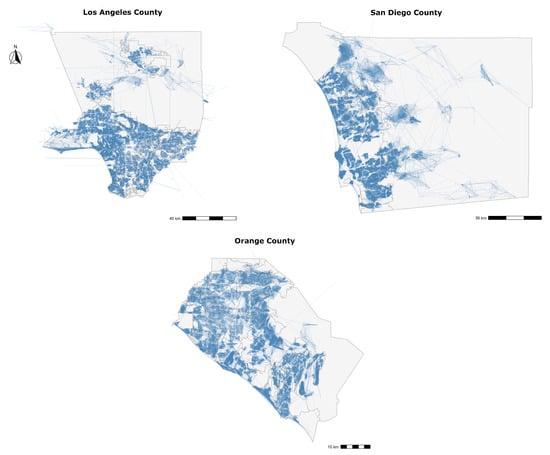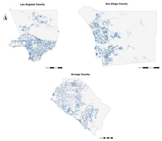 Table 3 shows the performance of each tabulation criterion as a predictor for a property feature. Highest values for each property feature are highlighted in red. A linear regression model is able to explain a linear relation between a continuous value and a set of predictors, and a high R-squared value means that the selected predictors are able to explain much variance in the independent continuous value. As an added step, we applied bootstrapping to our linear regression models. Bootstrapping [] is a non-parametric approach to statistical inference which gives the standard errors and biases of the true coefficients of the model. It works by drawing random samples from the data and by computing statistics on each of those samples. This step adds another level of accuracy to our models. We present the accumulated adjusted R-squared values, their biases, and the standard errors in the table, after resampling from the data 100 times. We show that the delineated neighborhoods outperformed ZIP code and Census tract proxy neighborhoods in Orange and San Diego counties, and were on par with Census tracts in Los Angeles County, with a few exceptions. We also show a table with adjusted R squared values computed by fitting a series of linear regression models without bootstrapping in Appendix B. The results here are significant, not only from a statistical standpoint, but also from the fact that we only used a single feature to produce these neighborhoods. The high performance of our neighborhoods was also not due to the numerical advantage, as there were more Census tracts in Los Angeles county than the number of neighborhoods generated there, and we are presenting the adjusted R squared values, which do account for the number of estimators used in a regression model.
