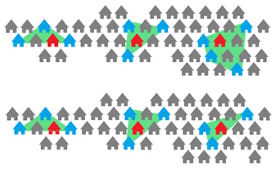 To delineate neighborhoods that represent properties that are similar in characteristics, we need to first reduce the overload of coverage in the dense regions. To do so, we will utilize the distances between subjects and their comparable properties, and use them in a spatial filter, to prune these regions. Once we apply the filters, we can then apply a clustering algorithm to delineate neighborhoods. Demšar et al. [] detailed applications of principal component analysis (PCA) on spatial data to reduce dimensionality, while Hughes and Haran [] also discussed getting results by reducing dimensions on non-Gaussian spatial data. Additionally, the iterative self-organizing data analysis technique algorithm (ISODATA) is a popular option for unsupervised segmentation of spatial data, as shown by [,], for segmenting remote sensing images. These reduction and segmentation algorithms, however, require a multidimensional feature space and because of their sensitivity to dimensions, exhibit poor speeds when the number of dimensions increase [].