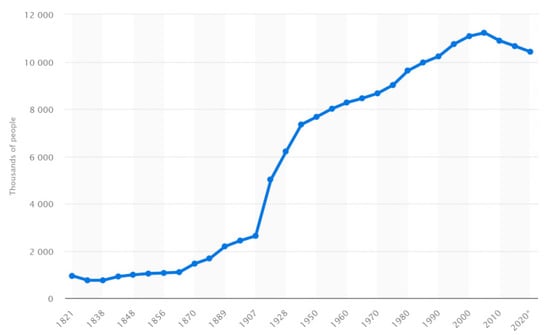 Long-term population growth in this country has been particularly heterogeneous over time (Figure 2), rising slowly between 1821 and 1907, and increasing more rapidly between 1907 and 1951, mostly because of refugee immigration from Asia Minor and high fertility. Since 1951, the resident population grew in a rather linear fashion, passing from 8 million inhabitants in 1951 to nearly 11 million inhabitants in 2001, and declining slowly in the subsequent two decades. Based on this evidence, the present study evaluates demographic trends in Greece during a period characterized by continuous and mostly linear population growth. Despite some regional differences, post-war population trends were exemplifications of demographic dynamics typical of Southern Europe. While displaying heterogeneous demographic trends at the regional and local scales, overall population density in Greece was rather low (less than 100 inhabitants/km2), with the highest value observed in 2000.