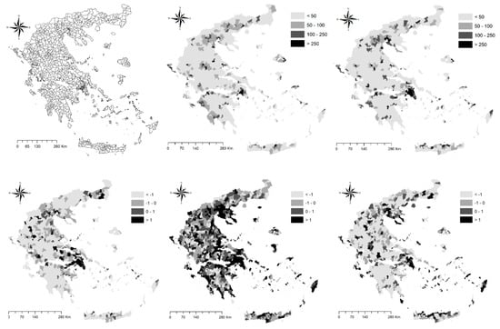Based on earlier research [3,9,10,24,45], the present study was grounded in a spatially explicit analysis of two variables (demographic density and the annual rate of population growth) at the spatial level mentioned above. Population density (resident population per municipal area in inhabitants/km2) and per cent annual rate of population growth at five different intervals (1961–1971, 1971–1981, 1981–1991, 1991–2001, 2001–2011) were estimated for each spatial unit. Data were processed and analyzed with spreadsheets and mapped in ArcMap release 10.5 (ESRI, Redlands, CA, USA) using a shapefile of Greek municipalities. Spatial autocorrelation analyses of spatial dependence and heterogeneity, based on global and local Moran’s coefficients and a local regression approach (geographically weighted regression) controlling for spatial structures separately for each time point, were adopted in this study and are described extensively in the following section.