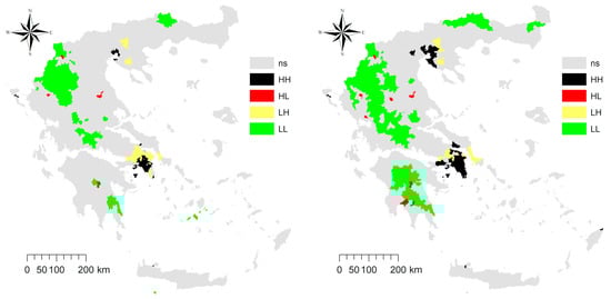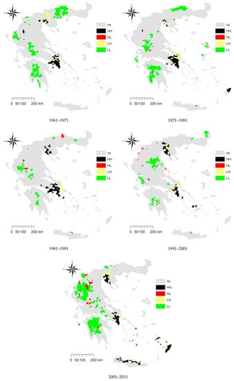 Maps illustrating spatial clustering of population density in Greece (left: 1961; right 2011; HH: High–High hotspots, HL: High–Low coldspots, LH: Low–High coldspots, LL: Low–Low hotspots, ns: non-significant).