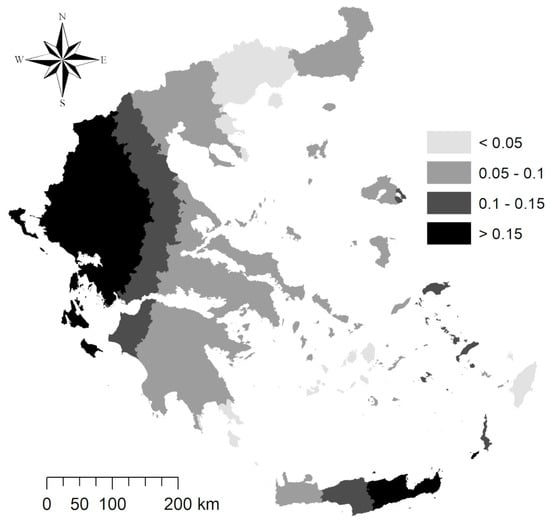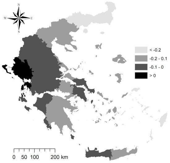 The GWR model for the decade 1981–1991 provided very low local R2 coefficients across the whole of Greece. Consequently, local regression coefficients showed values close to 0 (both for the model’s slope and intercept); standardized residuals were distributed almost randomly. The GWR model for the 1991–2001 decade displayed moderately low local R2 coefficients across the whole country, except for Northeastern Greece. Consequently, local regression coefficients showed values systematically close to 0 for both coefficients. Slopes >0.1 were observed in Attica and Northwestern Greece. In the last decade of the study (2001–2011), the GWR model showed a greater goodness of fit (local adjusted R2) in Northern Greece and the Peloponnese region and a lesser fit in Attica, Thessaloniki, the islands of Cyclades and Dodecanese and Central Greece. The highest slope coefficients were observed in Northern Greece. Intercept coefficients were negative all over the country. As expected, the model’s residuals were distributed heterogeneously over space.
