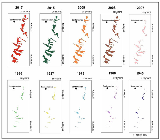 The evolution of the 21 landslides mapped from the orthomosaics during the 1945–2017 close to the Santomerion Village.