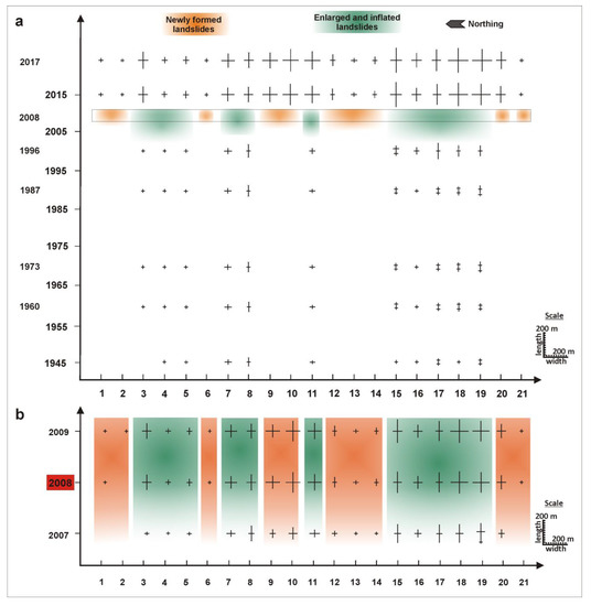 Apart from the qualitative and quantitative landslide evolution, Figure 6 indicates that even without seismic events, there is a slight increase in landslide area. In particular, high seismicity periods with enormous landslide increase are followed by a small landslide increase. A detailed example of the latter is depicted in Figure 6a,b in landslide number 16. The estimated values of length and width relative to acquisition date were 45 and 44 m from 1945–1987, 85 and 71 m in 1996, 106 and 94 m in 2007, while they were 151 and 113 m in 2008, and 154 and 117 m from 2009–2017, respectively. Results showed an error of less than 2%.