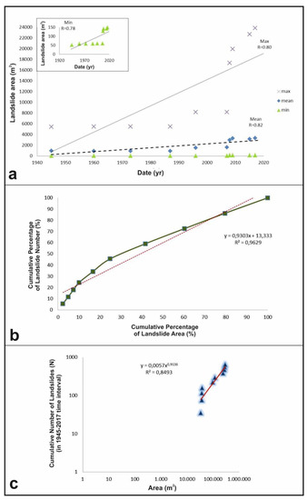 (a) Correlation between dates, minimum, maximum, and mean area of studied landslides from 1945 to 2017. The insert shows the minimum area distribution in a larger scale; (b) The cumulative percentage of landslide number is plotted against the cumulative percentage of landslide area; (c) Regression analysis using the log-log scale. The coefficient of determination, R2, denotes the strength of the linear association between the cumulative number of landslides and area.