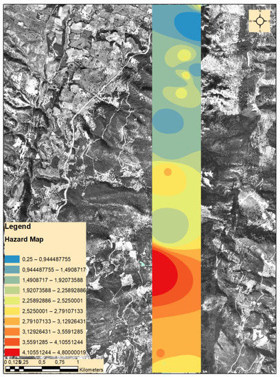 According to their shape (I, J, and Δ), the landslides are classified in three categories, rated from 1 to 3. The landslides that form a Δ-shape are characterized as less dangerous and rated with value 1, while the I-shaped landslides are the most dangerous, rated with value 3. The enlargement rate of these landslides range between 0.5 and 4.8 m/yr. As quantitative hazard and risk acceptance criteria are usually expressed in annual terms, the annual evolution rate of each landslide measured in m yr−1 is used in order to classify the landslide hazard. The evolution rate is classified in four categories from 1 to 4. The enumeration of the two factors (landslide shape and annual evolution rate) is presented in Table 4. Spatial interpolation algorithm has been used in order to produce the landslide hazard map (Figure 14).