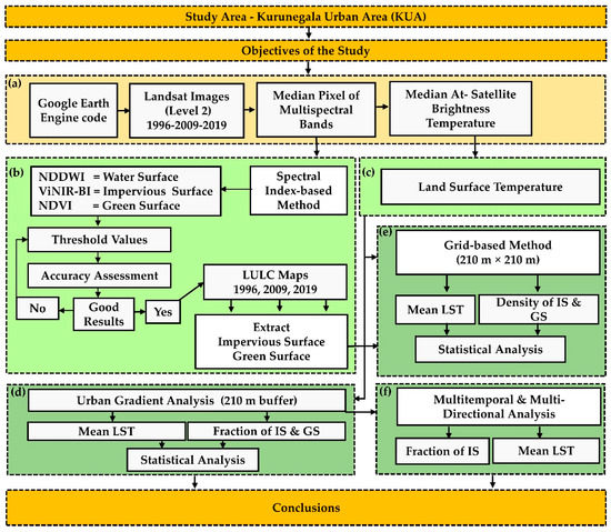 The workflow of the study: (a) use of Google Earth Engine (GEE) to extract bands of Landsat images; (b) land cover extraction; (c) Land Surface Temperature (LST) retrieval; (d) use of urban gradient analysis; (e) use of the grid-based method; and (f) use of multitemporal and multi-directional analysis.