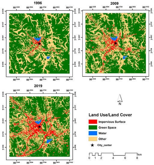 The results revealed that the increase in the IS area occurred at the expense of the GS area and the remaining other land covers in the study area between 1996 and 2019. The GS area declined with an annual rate of −55.5 ha per year (Table 1). These rapid changes in the GS area are consistent with those observed in the other cities in Sri Lanka, such as Colombo [12,19], Kandy [9,55] and Nuwara Eliya [14,15]. The rapid urbanisation in the KUA resulted in the conversion of more naturally vegetated areas into the IS from 1996 to 2019. The decreasing trend of the GS area has resulted in the loss of ecosystem services provided by the urban green environment of the study area. This has potentially also caused negative impacts such as the UHI.