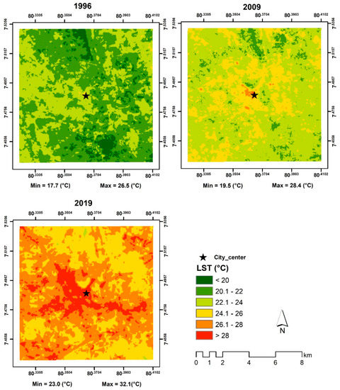Figure 4 shows the LST distribution of the KUA in 1996, 2009 and 2019. In 1996, LST ranged from 17.7 °C to 26.5 °C with a mean of 21.6 °C; in 2009, LST ranged from 19.5 °C to 28.4 °C with a mean of 23.5 °C; and in 2019, LST ranged from 23.0 °C to 32.1 °C with a mean of 26.5 °C.