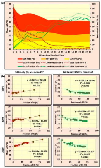 (a) The spatial pattern of mean LST, and the faction of IS (FIS) and the fraction of GS (FGS); (b) results of linear regression analysis along URGZ, 1996, 2009 and 2019.