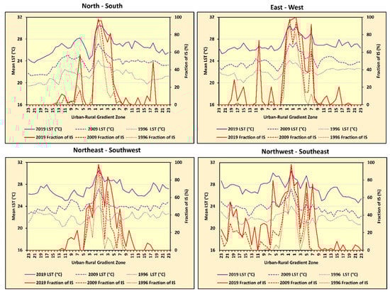 The multidirectional and multi-temporal analysis of mean LST and the FIS can also help to understand the urbanisation pattern of the study area and its impact on enhancing the UHI profile of the city. The analyses showed that IS development largely occurred around the city centre (Figure 6). The UHI formation showed an increasing trend of IS occurring mainly in the north, south, east and northwest compared to the west, northeast, southwest and southeast of the study area. Therefore, future urban policies and planning strategies on UHI mitigation should have a strong focus on the north, south, east and northwest directions. In addition, the mixture of LULC would provide a significant contribution to minimizing UHI [70].