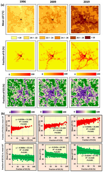 (a) Graphical view of the 210 × 210 m polygon grid showing maps of the Mean Land Surface Temperature (MLST), the fraction of IS (%) and the GS (%), (b) Scatterplots showing the relationship between the fraction of IS (%), GS (%) and mean LST in 1996, 2009 and 2019.