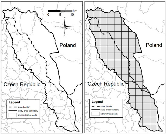 Figure 2 presents the study area with a basic administrative division and a square grid. The irregularity of the administrative boundaries and the different areas of municipal (commune) districts in Poland and the Czech Republic clearly limit potential comparative spatial analyses (e.g., on the Polish side, there are only seven administrative units of different sizes). Such high diversity of statistical research units compelled us to select arbitrary square grids for analysis. The undoubted advantages of using grid cells include their ease of use for automatic determination using GIS and to perform analyses.