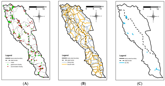 The analyzed tourism infrastructure in the study area: (A) accommodations, gastronomic facilities, and roads; (B) marked hiking and cycling trails; (C) ski-lifts. Source: authors’ own research.