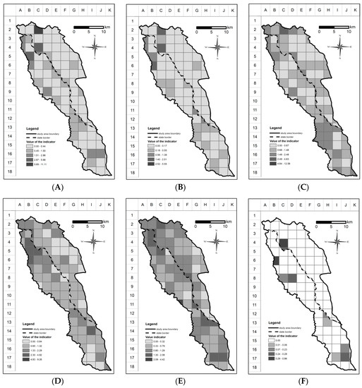 For all analyzed features, the following component indicators were used—Id (number of objects or the length of linear objects per one square km), which are described in the literature on the subject [87]. The general formula for the indicator is