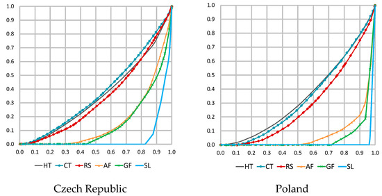 Spatial concentration (Lorenz curves) of tourism infrastructure in the Czech (left) and Polish (right) research areas. Note: The curves between Poland and Czech Republic cannot be compared due to differences in the number and area of the research fields clipped to the study area boundaries. Acronyms: HT—Hiking Trails; CT—Cycle Trails; RS—Roads; AF—Accommodation Facilities; GF—Gastronomic Facilities; SL—Ski Lifts. Source: authors’ own research.
