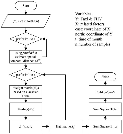To address this issue, Fotheringham et al. proposed a local regression model called Geographically Weighted Regression (GWR) [15], which improves the accuracy of regression results by constructing a local spatial weight matrix for estimating variation in space. Furthermore, the GWR model extends the traditional regression framework by allowing parameter estimates to vary in space and is therefore capable to capture local effects. The GWR model has been widely applied in transit ridership analysis [16,17]. For example, based on NYC’s taxi data, Qian et al. [18] used the GWR model to analyze the relationship between taxi locations and urban environmental factors. The results show that the GWR model can provide better model accuracy and interpretation than the OLS model. One of the remaining problems is that the GWR model only obtains related variable coefficients in the spatial dimension. While dealing with time series datasets, those data often need to be aggregated or separated based on their timestamps, thereby ignoring the fact that the distribution of taxis or TNCs varies with different scales of time. Recently, scholars have put forward many improved strategies to account for both temporal and spatial variability, such as the GWR-TS [19] and linear mixed effect (LME) + GWR models [20]; still, these models are generally based on the two-stage least squares regression [21], first fitting the temporal effect using the LME model and then evaluating the spatial heterogeneity effects with the GWR model. Those models cannot simultaneously consider temporal and spatial effects.