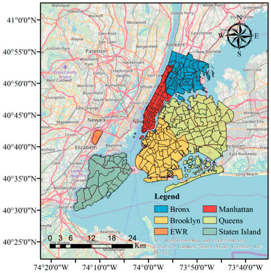 The study area of NYC consists of five boroughs, including the Bronx, Brooklyn, Staten Island, Queens, and Manhattan. As shown in Figure 3, NYC is divided into 263 taxi zones, including three airport zones, 55 yellow zones (only yellow cabs are allowed to pick up passengers) in Manhattan, and 205 borough zones, in which both types of taxis are allowed to operate. TNCs are allowed in all areas. Previous scholars’ research [32] reported that 95% of yellow passengers are concentrated in the Manhattan area, indicating that there were obvious imbalances in terms of spatial distribution and emphasizing the need to establish the GTWR model.