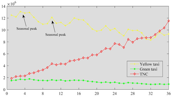 With the popularity of mobile phone usage, transportation network companies (TNCs) that offer app-based services, such as Uber, DiDi, and Lyft, claim to provide stability and convenience with peer-to-peer (p2p) processes that connect passengers and private drivers on-line and in real-time [1]. As an emerging form of transportation based on network and mobile technology, the analysis of TNC ridership has become a hot topic in urban transportation research. Much evidence has shown that the rapid development of TNC has had a huge impact on the traditional taxi (TT), leading the taxi industry to experience significant losses in terms of market share, revenue, labor power and facility [2]. This is particularly obvious in large modern cities such as New York City (NYC), where the annual taxi load decreased from 145 million in 2015 to 113 million in 2017, decreasing nearly 23% in three years. In contrast, the ridership by TNCs increased from 37 million to 110 million. The reduction in the market share of the taxi industry will inevitably cause a decline in the income of taxi drivers and the compression of the taxi business scale, leading to economic difficulties and even the bankruptcy of taxi companies. In May 2013, although the price of a yellow car’s license plate in NYC had been cut in half, the licenses of many taxi company vehicles were idle because of the lack of new drivers [3].