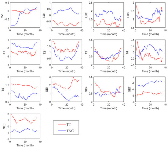 For the temporal effect of influencing factors on TT and TNC ridership, we take the month as the time interval and use the median of coefficient values of two GTWR models, i.e., TT and TNC to plot the corresponding temporal variation for each influencing factors respectively. According to Figure 5, some interesting findings can be summarized.