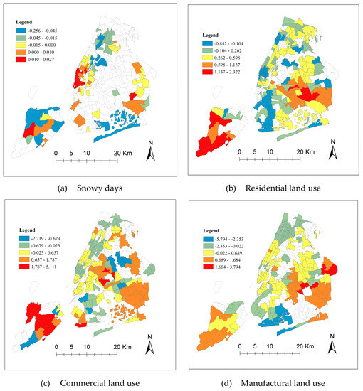 Taking the coefficients of the PoT model as an example, Figure 6 shows the spatial distribution of coefficients for weather- and land use-influencing factors using graduated colors as rendering style. Figure 6a shows that the spatial distribution of the coefficients for snowy weather is positive in the southern of Manhattan, the central of Staten Island and the JFK airport, which naturally reflects the fact that TNC trips are aggregated in these TAZs to create higher fares that come from short, frequent trips in midtown or long-distance trips from the airport during snowy days.