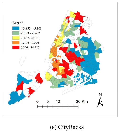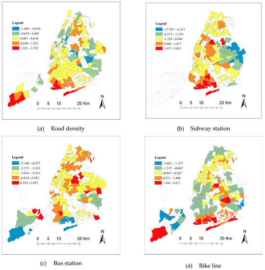 The spatial distribution for five transport-related factors is presented in Figure 7a–e. The spatial distribution of road density coefficients in Figure 7a shows that while high-density roads have positive effects on the share of TNC ridership in general (T1, 0.11), such as in Brooklyn and Staten Island, they also exhibit negative effects in downtown Manhattan and Queens. Normally, TAZs with a higher distribution of other transport POI, such as buses, subways, and bicycles, are correlated with higher passenger density and may produce more taxi/TNC ridership. Figure 7b shows that, in the middle of NYC where the subway system was highly developed, the number of subway stations appear to positively correlation for the increase of proportion for TNC. With respect to the east side of NYC, especially for those areas near the boundary, the negative correlation was observed, revealing this as another pattern of the TNCs experience of growth due to the insufficient of subway stations. Figure 7c shows that the reasons of the increase of TNC trips in Staten Island might be attributed to two aspects: (1) the bus stops in these areas bring in massive amounts of passengers with travel needs; (2) the lack of subway stations and low concentration of TTs in these areas causes these passengers to only rely on TNC, eventually leading to an increase in TNC’s market share.
