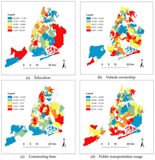 For the socioeconomic-related factors, Figure 8a–d visualize the spatial distribution of the coefficients for SE1, SE4, SE7, and SE8 respectively. The temporal changes of SE1 in Figure 4 imply that TAZs with people who received relatively higher education levels may use TTs more often. On the contrary, areas with more private cars (SE4) may generate more TNC trips. By comparing the Figure 8a,b, we observed a consistent pattern, that the spatial distribution of coefficient for Bachelor’s degree is opposite to the distribution of vehicle ownership. To be specific, we found that highly positive coefficients of education are mainly distributed in the remote TAZs, such as East Queens and South Staten Island. As TTs rarely reach these areas and public transportation is inadequate, the probability of hailing a TNC by people with high education/income is significantly increased. Meanwhile, in high-traffic TAZs such as Manhattan, the coefficient is positive due to the better flexibility provided by TNC. It can be seen from Figure 8b that the highest value of coefficients for vehicle ownership was observed at the central of NYC. This indicates that a higher density of private cars in these areas may generate more TNC trips. Although the correlation is positive in general, TAZs in East Queens present negative correlation. A possible explanation is that it is difficult and costly to ride a taxi from these places [18]. As a result, people may use their own vehicles. Finally, the spatial distribution of coefficients for average commuting time and public transportation usage is shown by the following Figure 8c,d. The spatial pattern of the coefficients for commuting time (SE7) takes the greatest around the center of Manhattan, which indicates that the lengthy commuting increases the utility of TNC and thus reducing the taxi ridership. However, considering the fact that public transportation (SE8) is more developed in the west than in the east, the coefficients for SE8 exhibit opposite spatial distribution characteristics as the commuting time. The reasons that SE8 is more positive for TNCs in Western NYC could come from two aspects: the huge amount of passengers brought by the developed public transportation network in the central city, and the absence of TTs in remote areas such as Staten Island.