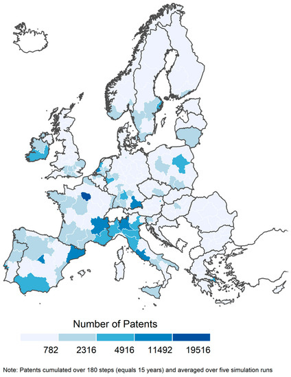 - Vermeulen, B.; Pyka, A. The role of network topology and the spatial distribution and structure of knowledge in regional innovation policy: A calibrated agent-based model study. Comput. Econ. 2018, 52, 773–808. [Google Scholar] [CrossRef]