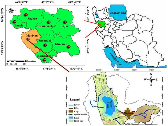 Zrebar Lake is located 3 km west of Marivan City in Kurdistan Province in western Iran (Figure 1). The lake is 1285 m asl, has a length of 5 km, a maximum width of 1.6 km, a maximum depth of 6 m, an area of 8.9 km2 and a volume of some 30 million m3 [51]. The water of Zrebar Lake is provided by seasonal rainfall (average precipitation is 650 mm/year) and subaqueous lake-bottom springs. The lake is immediately surrounded by a wetland complex and further surrounded by mountains, forests and croplands. Irrigated farms and rain-fed croplands comprise 60% of the land cover, oak forests 23% and grasslands cover 17% [52]. Zrebar Lake is the only freshwater lake in western Iran and is important for the local economy in terms of tourism, irrigation and fish harvesting.