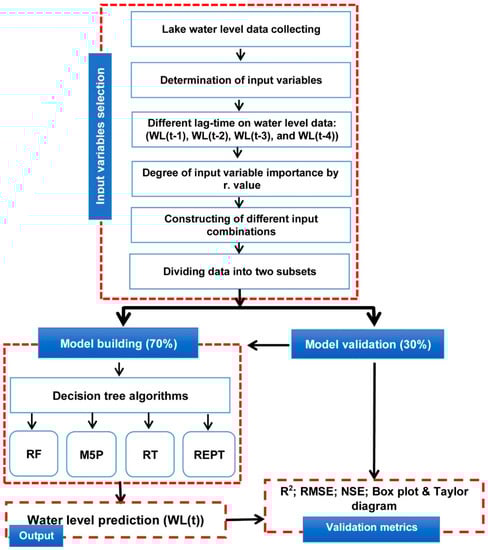 In this study, our goal is to assess different decision tree-based ML algorithms for predicting daily water level fluctuation in Zrebar Lake, including the M5 pruned (M5P), random forest (RF), random tree (RT) and reduced-error pruning tree (REPT) algorithms. The validation and comparison of these models was done using different quantitative indices, such as root mean square error (RMSE), correlation coefficient (R2), mean absolute error (MAE), percent bias (PBIAS), ratio of the root mean square error to the standard deviation of measured data (RSR) and Nash–Sutcliffe coefficient (NSE). The modeling and data process were designed and coded with MATLAB 2018.
