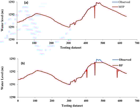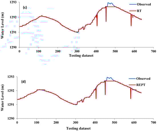 Line graphs of observed and predicted daily water levels of different models in the testing phase: (a) M5P; (b) RF; (c) RT; (d) REPT.
