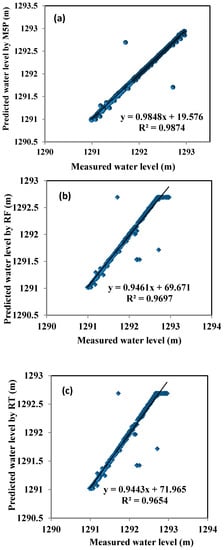 Figure 3 shows the line graphs and scatter plots of the observed and predicted daily water levels. The result shows that all the models predicted daily water level with a high level of accuracy, while only M5P was able to perfectly predict the maximum values of the water level fluctuation of Zrebar Lake. Also, M5P was the closest to the observed water level values and best line (45° line), with minimum scatter with the linear equation . Conversely, the REPT model provided the worst estimates with maximum scatter (Figure 4). This confirms that M5P outperformed the other models, including RF, RT and REPT. This result is in accordance with the evaluation criteria presented in Table 2.