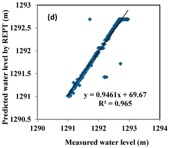 Scatter plots of observed vs. predicted water level (WL) s in the testing phase: (a) M5P; (b) RF; (c) RT; (d) REPT.