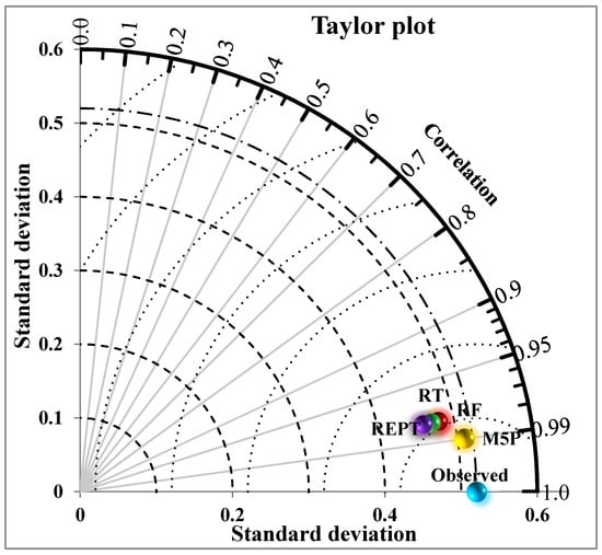 We also further analyzed model efficiency using Taylor diagrams (Figure 5) and boxplots (Figure 6). The closer the point of each developed model to the observed point location, the higher the performance. Here, our results also show that the models had good predictive power, but the M5P algorithm had a higher correlation and lower RMSE. Based on the normalized standard deviation values, the SD of the M5P model was similar to the observed SD, whereas REPT had a lower standard deviation, followed by the RT and RF models.