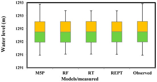 The results of the boxplot are presented in Figure 6. The boxplot for predicting maximum values by the M5P model was closer to the observed values, whereas REPT, RT and RF underestimated water levels. In term of quartile, the median and minimum values of all the models were able to predict WL values similar to the observed values with a significant degree of accuracy, although the M5P model outperformed the other models.