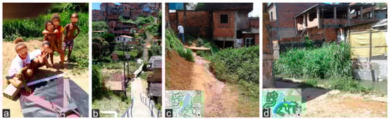 Scenes of Salvador’s slums, Brazil: (a) children either barefoot or with no clothes on playing in a lowland open area and watching the unmanned aerial vehicle (UAV) take-off; (b) narrow pathways and typical occupation of slopes; (c,d) open ground photo data archive Mapillary showing a humid unpaved pathway and house typology (Photos a and b by Patricia Brito).