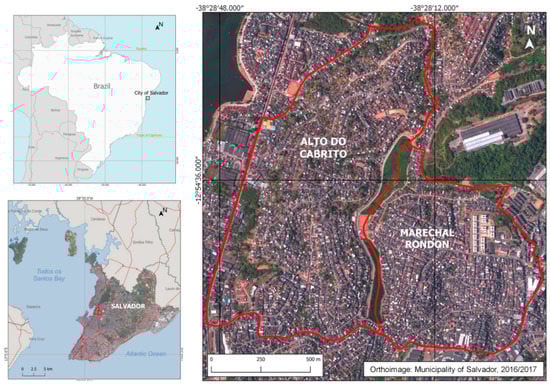 Overview of the case study area. Map of Alto do Cabrito and Marechal Rondon of Salvador City; Brazil (upper left); Salvador (lower left); case study neighborhoods (right). Produced by the authors. Data source: Brazilian Institute of Geography and Statistics (IBGE) and Municipality of Salvador.