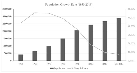 The city of Salvador is located on the coast of northeastern Brazil (Figure 3). Founded in 1549, it had its most significant expansion between the 1950s and 1970s, reaching, in 2019, an estimated population of 2,872,347 million people in the municipality of Salvador (Figure 4), and 3,929,209 million people in its metropolitan region [].