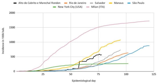 To analyze the specific spatial data needs for deprived communities in the COVID-19 context, we used the example of two areas where the group has established long-standing research on infectious diseases [,] and a partnership with community representatives. The neighborhoods of Alto do Cabrito (AC), and Marechal Rondon (MR) are in a peripheral region of the city (Figure 3). According to IBGE census data in 2010, it has a total of 36,521 dwellers, with 19,470 inhabitants in MR and 17,051 inhabitants in AC. Although the neighborhoods have internally different degrees of deprivation, these differences are relatively small compared to other neighborhoods in the city. In 2010, the two neighborhoods had a human development index (HDI) considered average, with values ranging from 0.647 to 0.712 []. The two areas had 31% of households with an income of half of the minimum wage per capita or less, which corresponded to USD 9.70 per day per person. About 99% of households had access to a water supply and 98% to sewerage systems []. The population over 60 years old was 3330 (8.5%), the illiteracy rate among youths aged between 7 and 18 years was 95% [], and 34% of households had more than two people per bedroom []. As the graphic in Figure 5 shows, the COVID-19 incidence rate in the two neighborhoods was higher than in the average of the city of Salvador. It took 78 days after the first case was registered in the area. This sums up to a total of 208 cases and an incidence rate of 569.5 cases per 100,000 inhabitants.