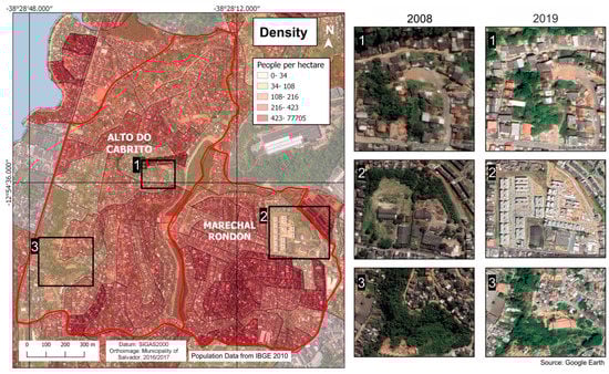 These two neighborhoods have four community associations that have been acting in accordance with WHO guidelines, state, and municipal government. Even so, leaders reported a large circulation of people and crowded situations at religious ceremonies, commerce, or even at soccer events and parties. Additionally, intermittent water supply services, serious financial difficulties for informal workers, and the existence of more families that, due the pandemic, depend on donations to feed themselves have increased given the delay and difficulty in accessing emergency government assistance. Figure 6 shows the population density based on census tract data from 2010 for the two settlements. In general, the areas have not changed much since the last census. However, in the highlighted areas 1, 2, and 3, changes have been observed. In addition, to visualize these changes, fragments from Google Earth images from 2008 and 2019 are shown.